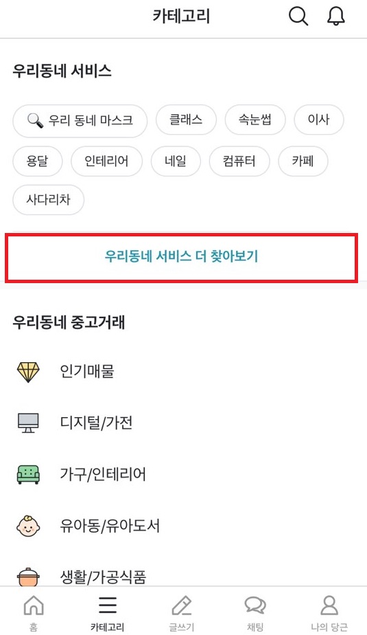 실제로 당근마켓 앱 내에는 '우리동네 서비스 더 찾아보기' 카테고리가 있습니다.