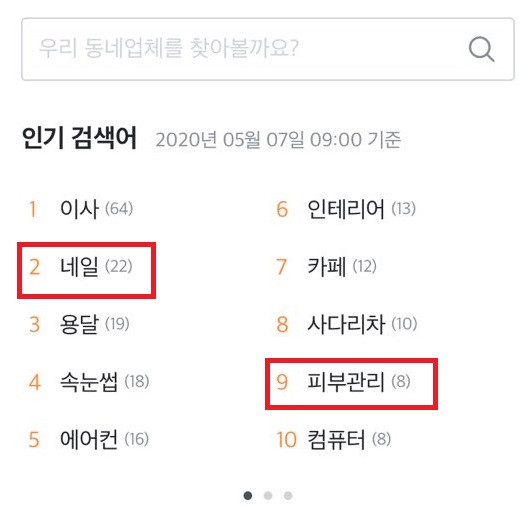 여기에는 이사, 네일, 에어컨, 인테리어, 빨래방, 요가, 세차 등이 인기 검색어에 노출돼 있습니다.